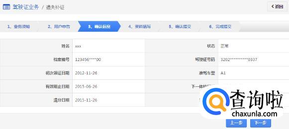 在该步骤,界面显示驾驶证的基本信息,用户认真确认各项信息无误后,点击“下一步”进入【资料填写】。