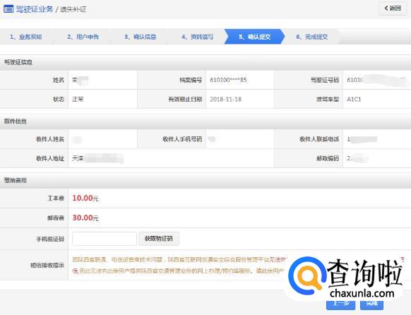 在该步骤,用户选择领取方式是邮政寄递或窗口自取。业务成功受理后,如果选择邮政寄递的,邮政人员将上门收取费用,交付机动车驾驶证及收费票据。如果选择窗口自取的,则自行到选择的自取网点窗口领取机动车驾驶证。