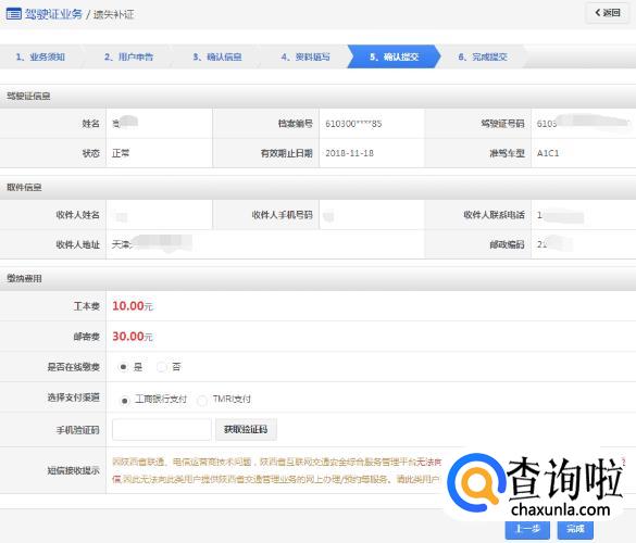 该步骤显示用户的驾驶证信息、领取详情以及需要缴纳费用信息,如果平台已开通在线支付功能,显示在线支付详情。