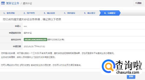 该步骤提交成功后,系统生成业务流水号。该步骤提交成功后,系统将于提交后的一个工作日(不含当天)受理(选择在线支付的业务费用支付完成后受理),届时会发送短信告知受理结果。用户可以根据该业务流水号在网办进度中查询业务办理进度。