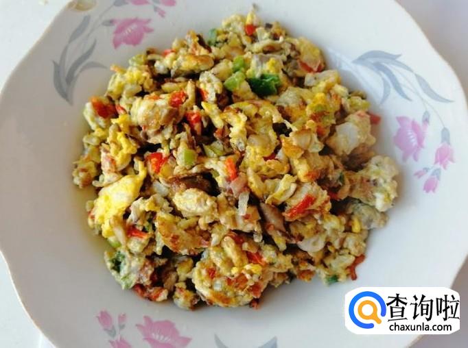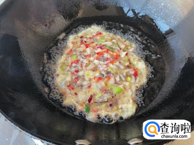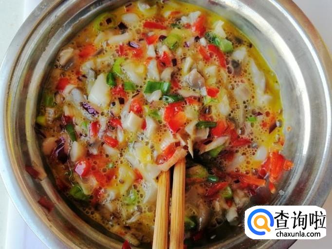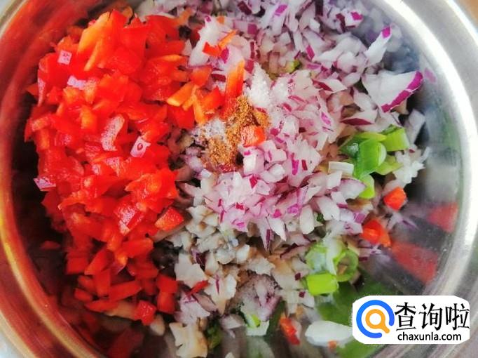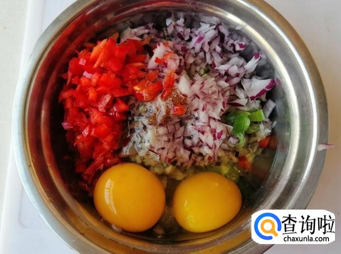 加适量盐,加入适量五香粉,放入切好的红菜椒末,磕入两个鸡蛋,都准备好待用。