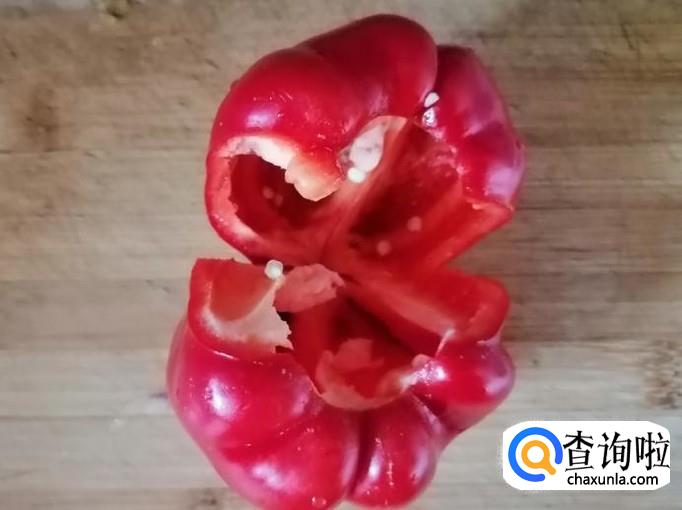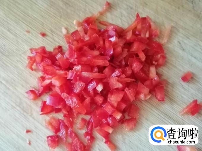 取一个新鲜的红色彩椒,用清水把彩椒洗净,然后把彩椒放在菜板上,用刀切成彩椒末,切好待用。
