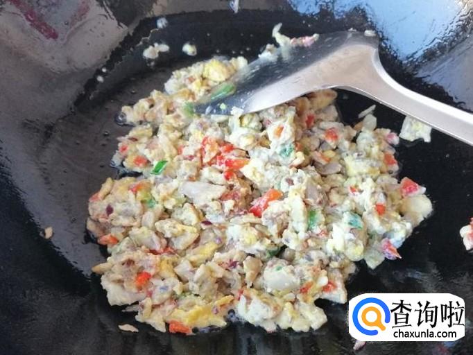 用筷子把加进去的食材搅拌均匀,炒锅放油,油热后倒入调好的蛋液蔬菜,用铲子翻炒均匀,炒熟后出锅入盘,这样我们的,蘑菇彩椒圆葱炒鸡蛋就做好了,看上去就好吃。