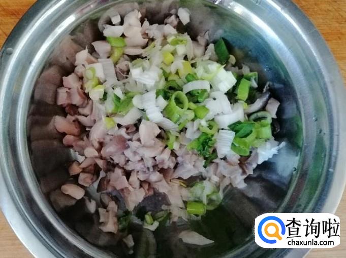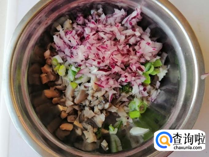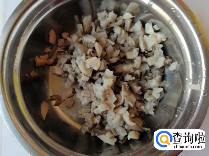 煮锅烧水,水开后把洗好的蘑菇烫两三分钟,烫好的蘑菇捞出放凉,然后用手攥掉蘑菇水份,把蘑菇切碎待用。