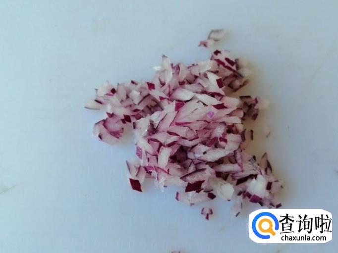 取适量圆葱,用清水把圆葱洗净,然后先把圆葱切丝,最后切成末,切好待用。用量根据自己喜好定。