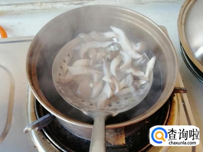取适量新鲜的蘑菇,剪去蘑菇老根,用清水把蘑菇洗净,然后把蘑菇撕成细条,放入容器中待用。