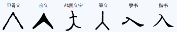 本义是“由外而内”,字形像一把箭镰或刀锋等尖锐的利器,它能射入或者嵌入别的物体,“入”还有“加入”(如“入伙”),“交纳”(如入栗“)等义。