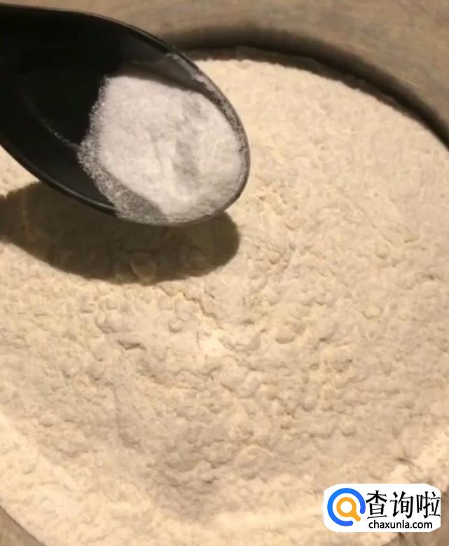 首先我们将500g面粉倒入盆中,加入4g小苏打,15g盐。