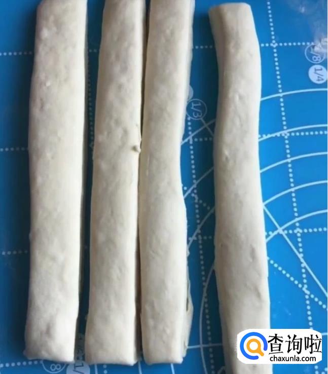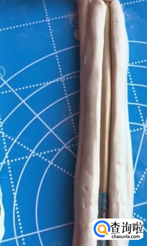 接着我们将醒发好的面团用擀面杖擀成面皮,切成条,两个一组叠在一起,用筷子压一下,这样就有形状了。