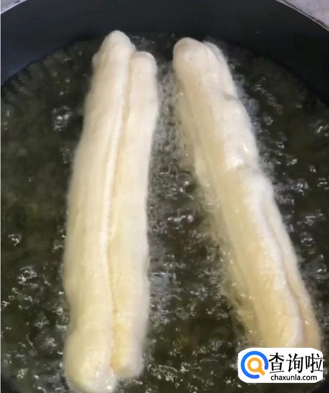 然后我们起锅烧油,油温五成热,下入油条,小火炸至金黄捞出控油,油条就制作好了!