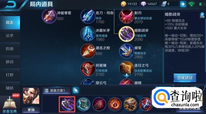 首先,我们第一件装备应该出暗影战斧,该装备是专门用来打脆皮用的,加上曹操的第一技能位移,在前期可以很好的抓一下脆皮英雄,此装备我们应该第一件装备就出。