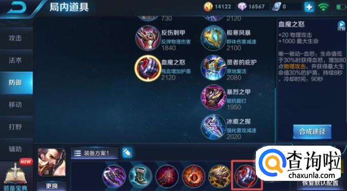 最后,我们该出血魔之怒,该装备主要也就是被动,可以让曹操在血量少的时候不至于瞬间死掉,可以让曹操躲过致命一击,然后可以开启大招从而打击对方。