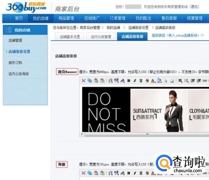 在"店铺高级装修"界面,我们可以设置店铺的首页和海报。首页是顾客进入店铺里的第一视觉,所以非常重要。首页宽度为960px,高度不限;海报宽度为781px,高度也不限。