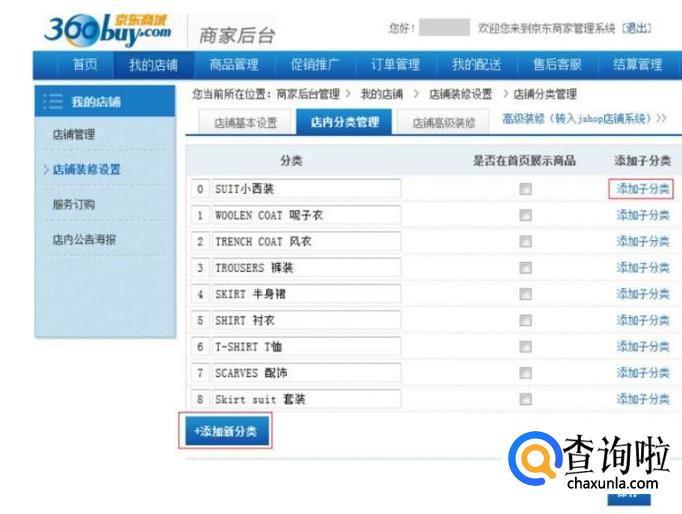 在"店铺分类管理"里面,点击左下方的"添加新分类"添加一级分类,然后点击右边的"添加子分类"充实刚刚添加的一级分类,添加完成后点击界面下方的"保存"就可以了。