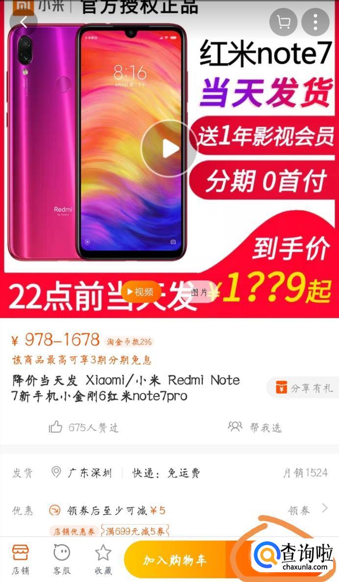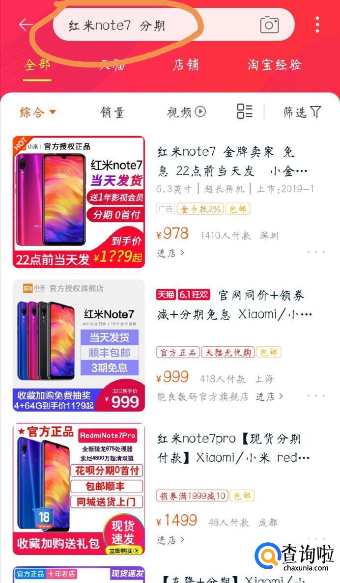 首先在淘宝的搜索栏中输入想要购买的手机,然后再加上“分期”的关键字,点击搜索,然后选择一个搜索结果,点击进入