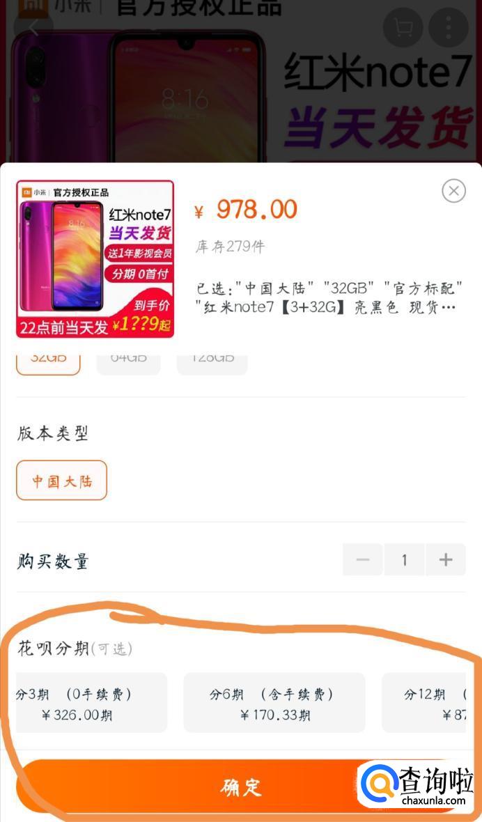 然后拖动到页面下方可以看到有分期购买的方式,选择一个适合自己的分期方式,点击确定,跳转到订单页面