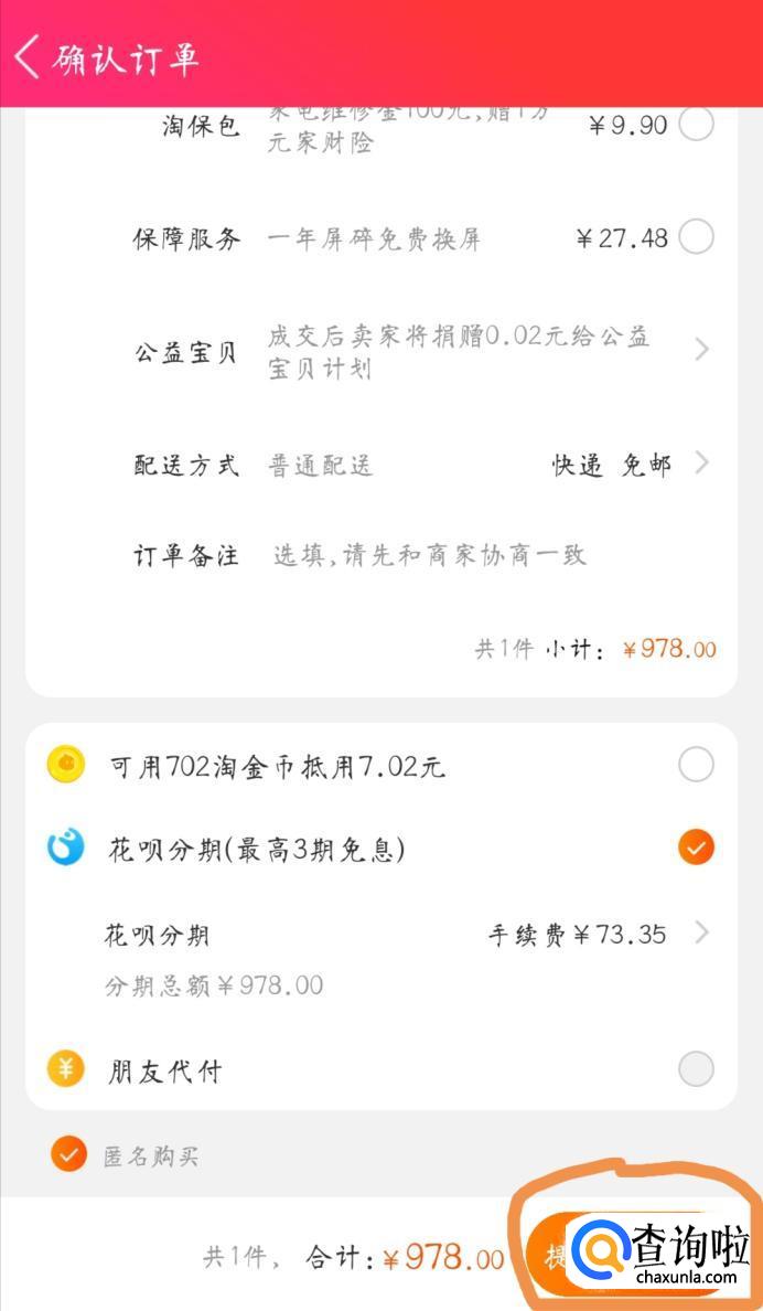 确认好订单页面的信息无误之后,点击右下角的“提交分期订单”,跳转到付款页面
