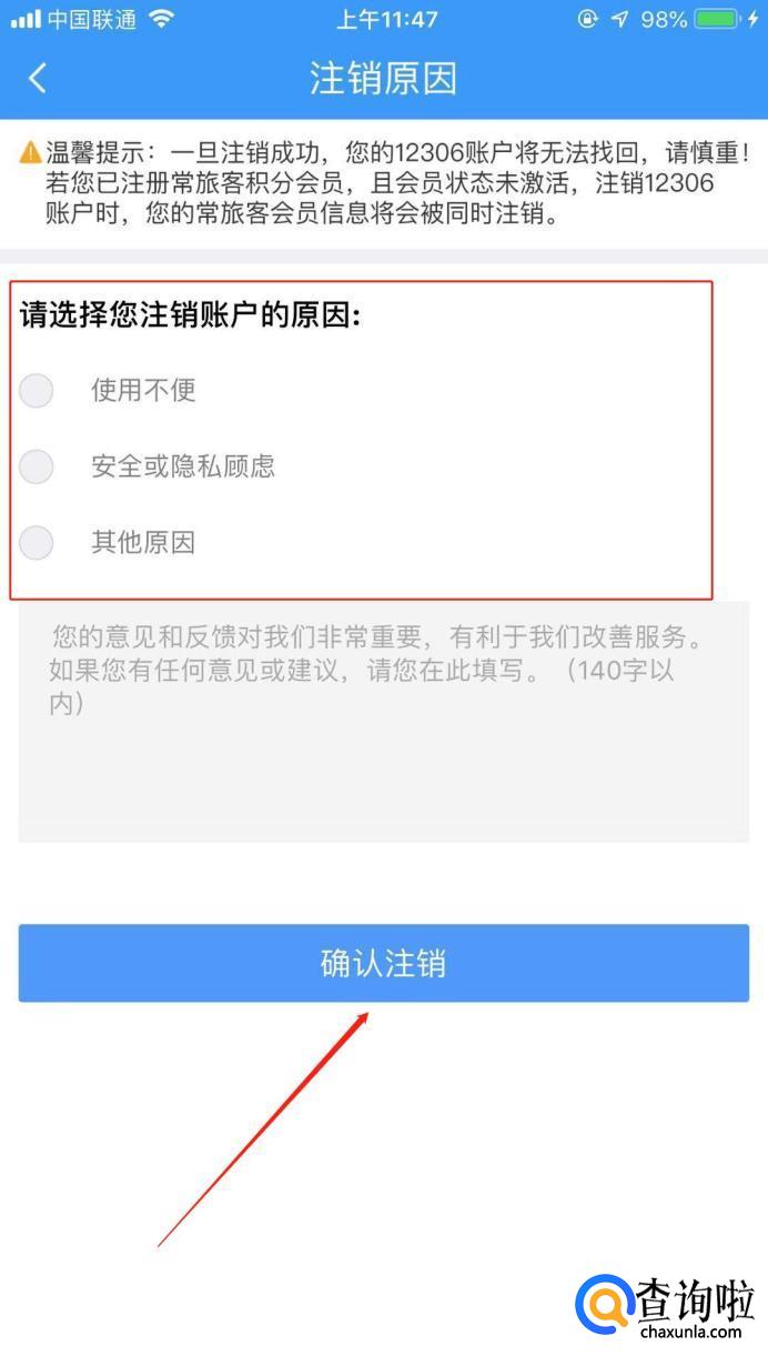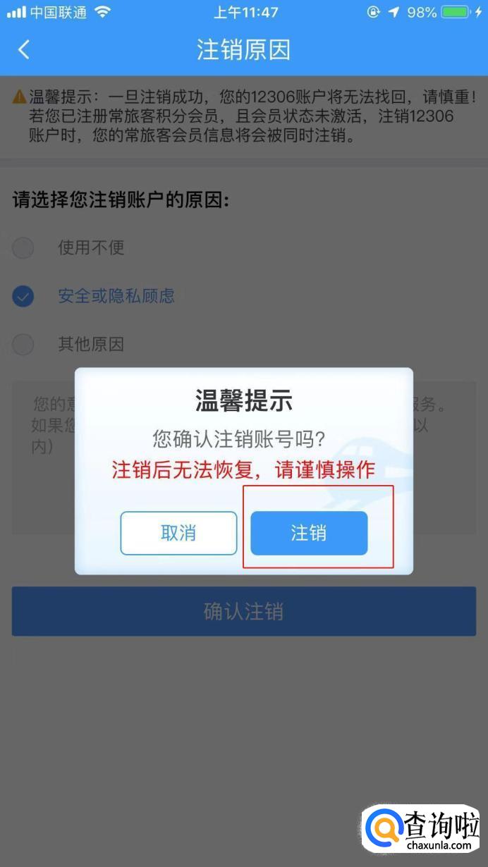 选好注销的原因,然后点击“确认注销”选项。