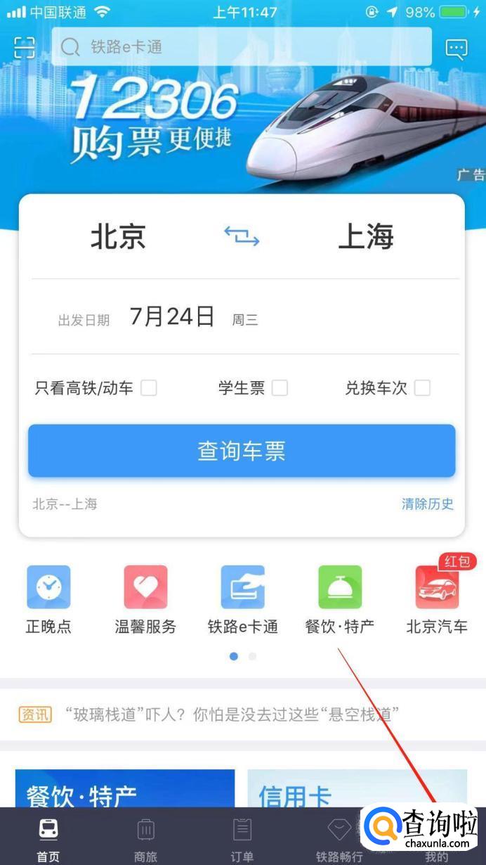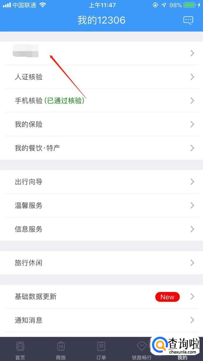 首先,在手机中打开“12306”软件,进入页面后,点击右下角的“我的”。