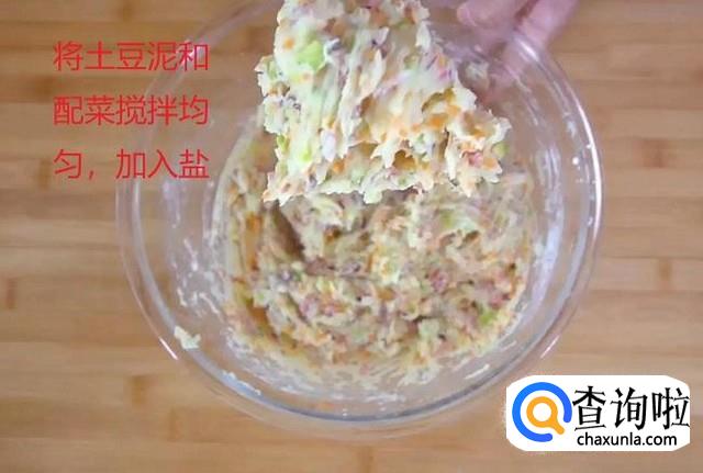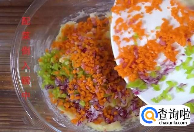 接着我们将准备好的配菜导入碗中和土豆泥混在一起,如下图所示