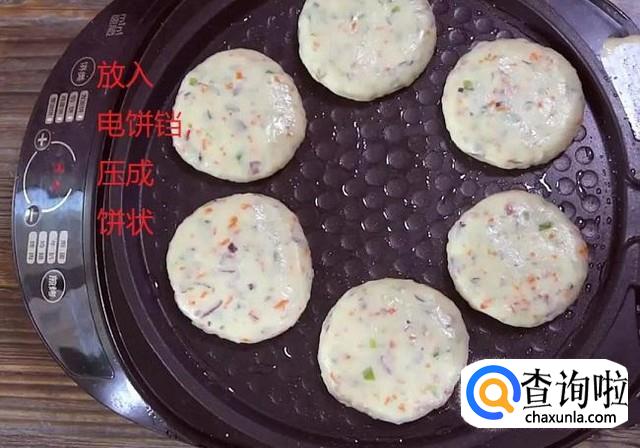 接下来将圆形的土豆泥放在电饼铛中,压成饼状,如下图所示,然后在电饼铛中放入油