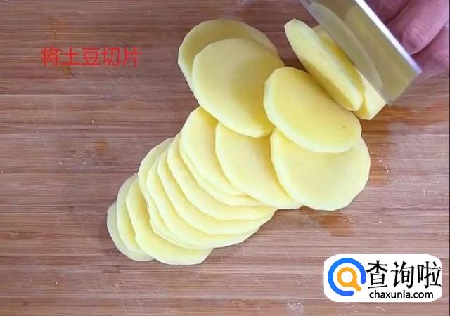 首先我们需要将土豆洗净放在案板上,然后将土豆切成片,如下图所示