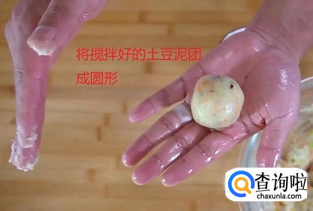 接着我们将做好的土豆泥取出团成圆形,如下图所示