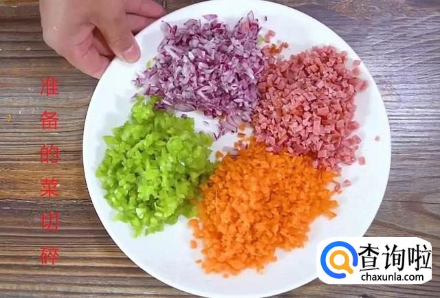 然后我们将准备好的胡萝卜,青椒,火腿,洋葱都切碎备用,如下图所示