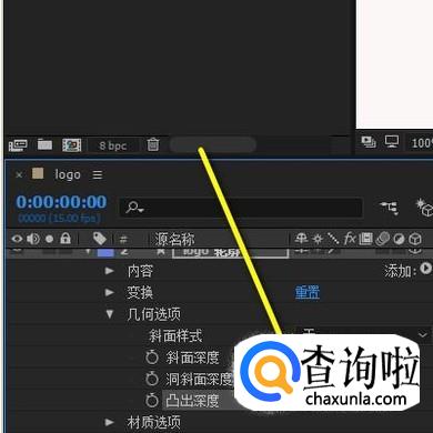 接下来,鼠标再点开logo轮廓图层的属性;在这里找到“凸出深度”这一项。把“凸出深度”的数值修改为25