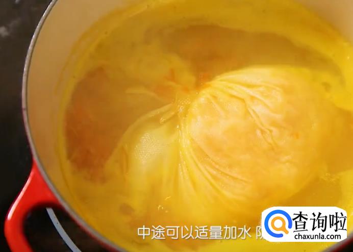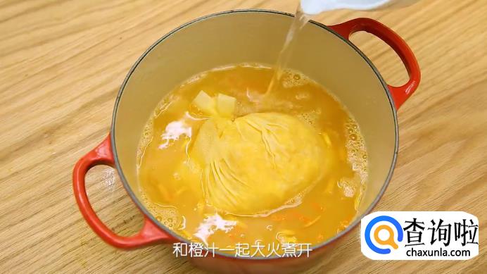 挤完果汁之后,把富含果胶的这一袋果肉扎紧,放入锅中。然后往锅里加入300ml的清水,和橙汁一起开大火煮开,煮开后再转中火煮1个小时左右,将果胶提炼出来,中途可以适量加水,防止煮干。