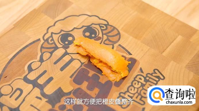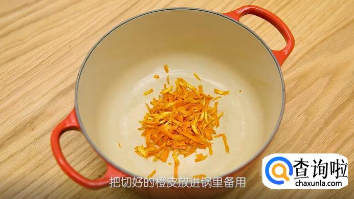 接着,用削皮器把橙子的皮刮下来,动作慢一点,尽可能刮出完整的一条,把切好的橙皮叠放整齐,再用刀将其切成小条,放入锅里备用。