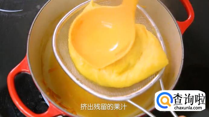 准备一个过滤包,把橙子的果肉全部放进去,戴上手套,将果汁使劲挤入锅中。因为制作果酱需要对水果中的果胶进行提炼,橙子是富含果胶的水果,不过都分部在橙皮和橙络里,所以要先把果汁挤出去。