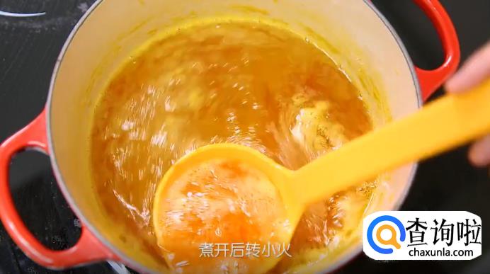 接下来,在装有果汁的锅里加入糖和柠檬汁,柠檬汁除了抗氧化和增加风味之外,还可以帮助果酱凝结。煮开之后转小火,再煮15分钟左右。