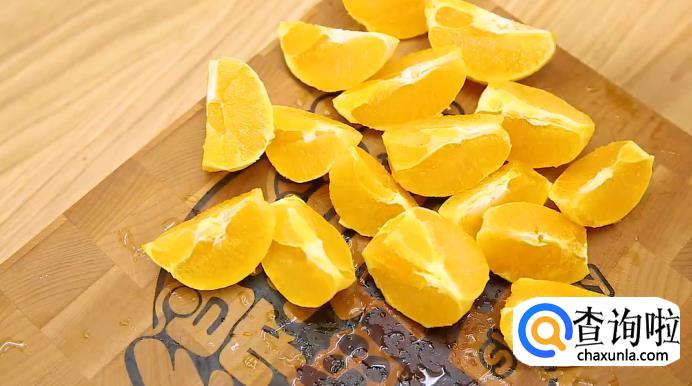 然后,把橙子对半切开,将果皮剥去。剩余的3个橙子也去掉外皮,留下果肉。