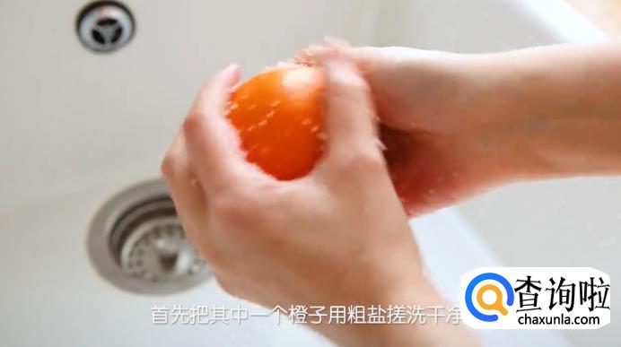 首先,把其中一个橙子用粗盐搓洗干净,然后再用清水将橙子冲洗一下。