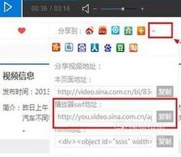 第三步,进入播放页面以后点击分享图标后面的小三角点击复制swf的地址