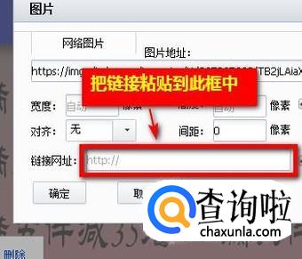 即时,弹出一个设置对话框,在对话框中,我们看到有一选项“链接网址”;我们就在这里把要添加的超链接粘贴到此框中。接着,再在左下角点“确定”;返回到模块这里再点确定。那么,给图片添加超链接的操作完成。