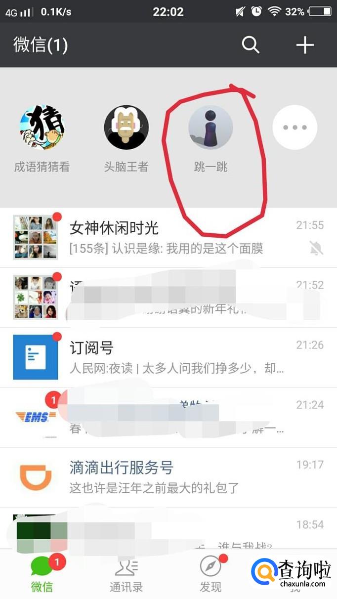 首先打开登录微信,最简单的方法就是直接在智能手机上下滑微信屏幕,就会出现跳一跳小游戏啦。如图