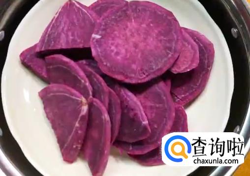 先将洗好的紫薯和南瓜切片,然后放进蒸笼里大火蒸熟。