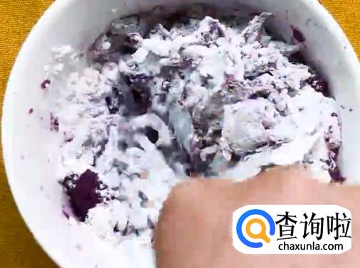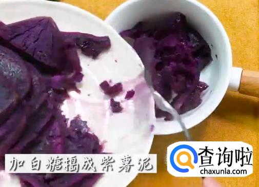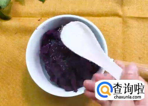 将紫薯倒入锅中,用勺子或铲子碾压熟透的紫薯成为紫薯泥。