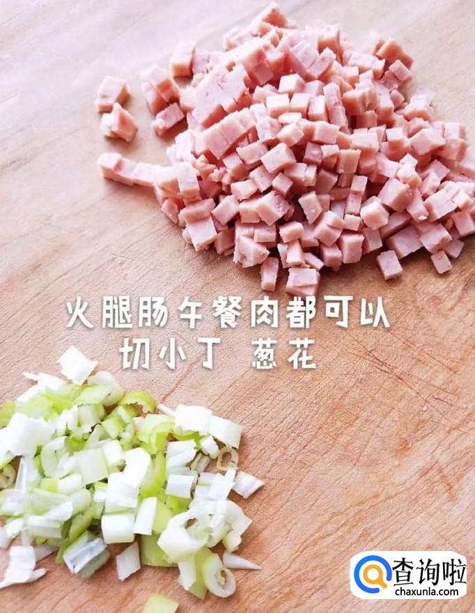 接着把火腿肠或者是午餐肉切成丁,香葱切成葱花,如下图所示。