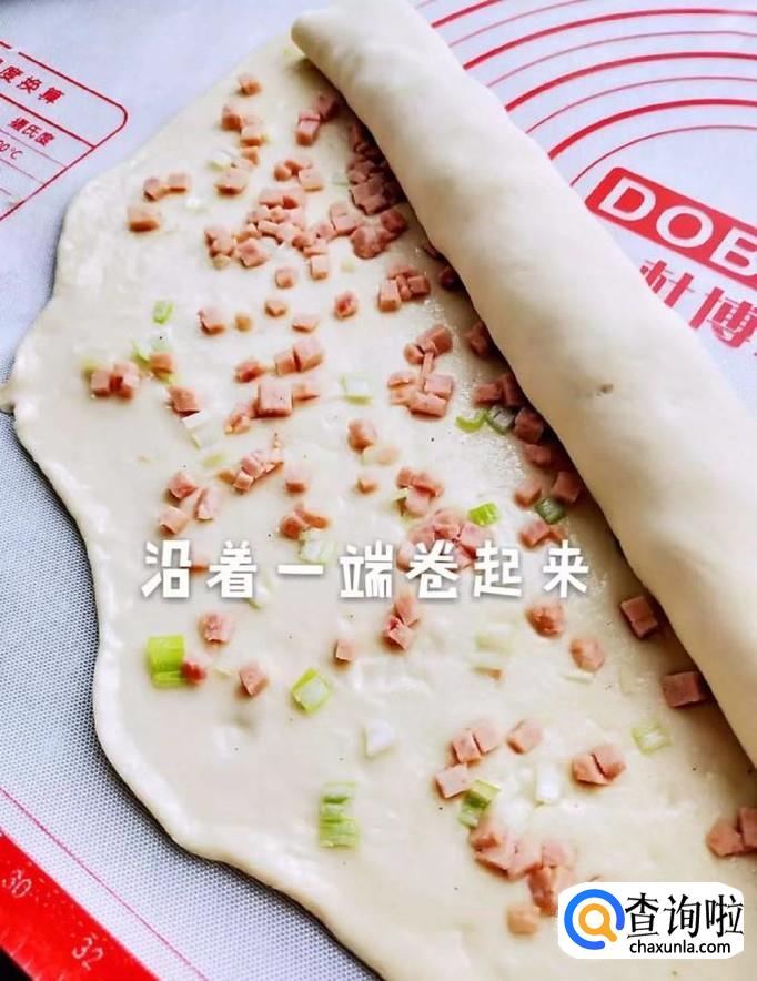 然后把发酵好的面用擀面杖擀成面皮,撒上火腿丁、葱花和适量的盐,如下图所示。