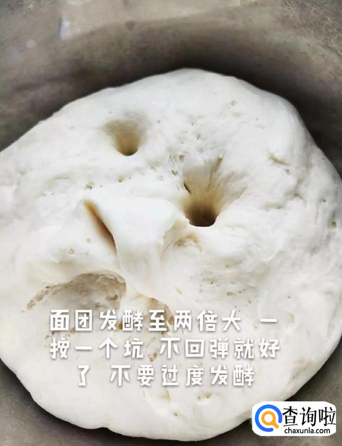 等到面团发酵到原先的两倍的大小,用手指插进面团不回弹,那么说明我们的面团就发酵好了。小贴士:注意面团一定不能发的过度,发酵的过程当中一定要注意。