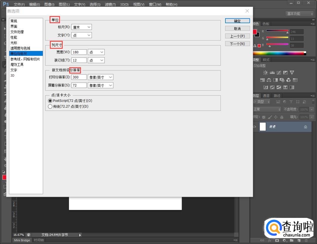 我们可以快速的设置标尺的单位、列尺寸、分辨率等参数。