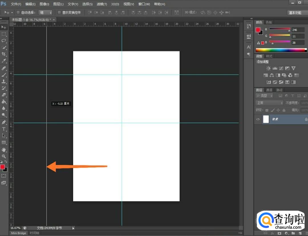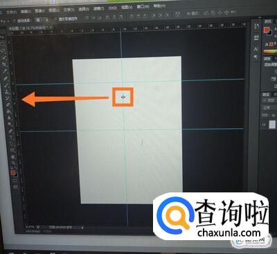 同理可知,如果我们要作出一条竖的辅助线,我们还是将鼠标放在标尺左边的内部,如图,然后按住鼠标向右拖,这时就可以拖出竖着的青色辅助线了,如图所示。