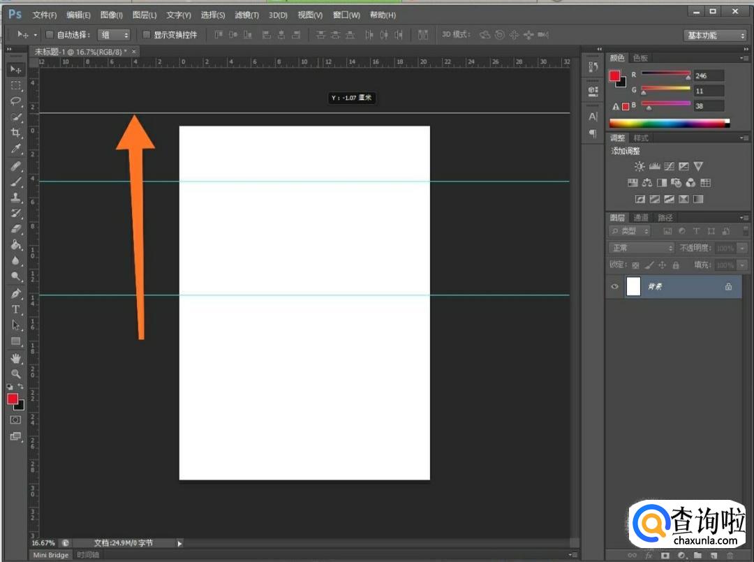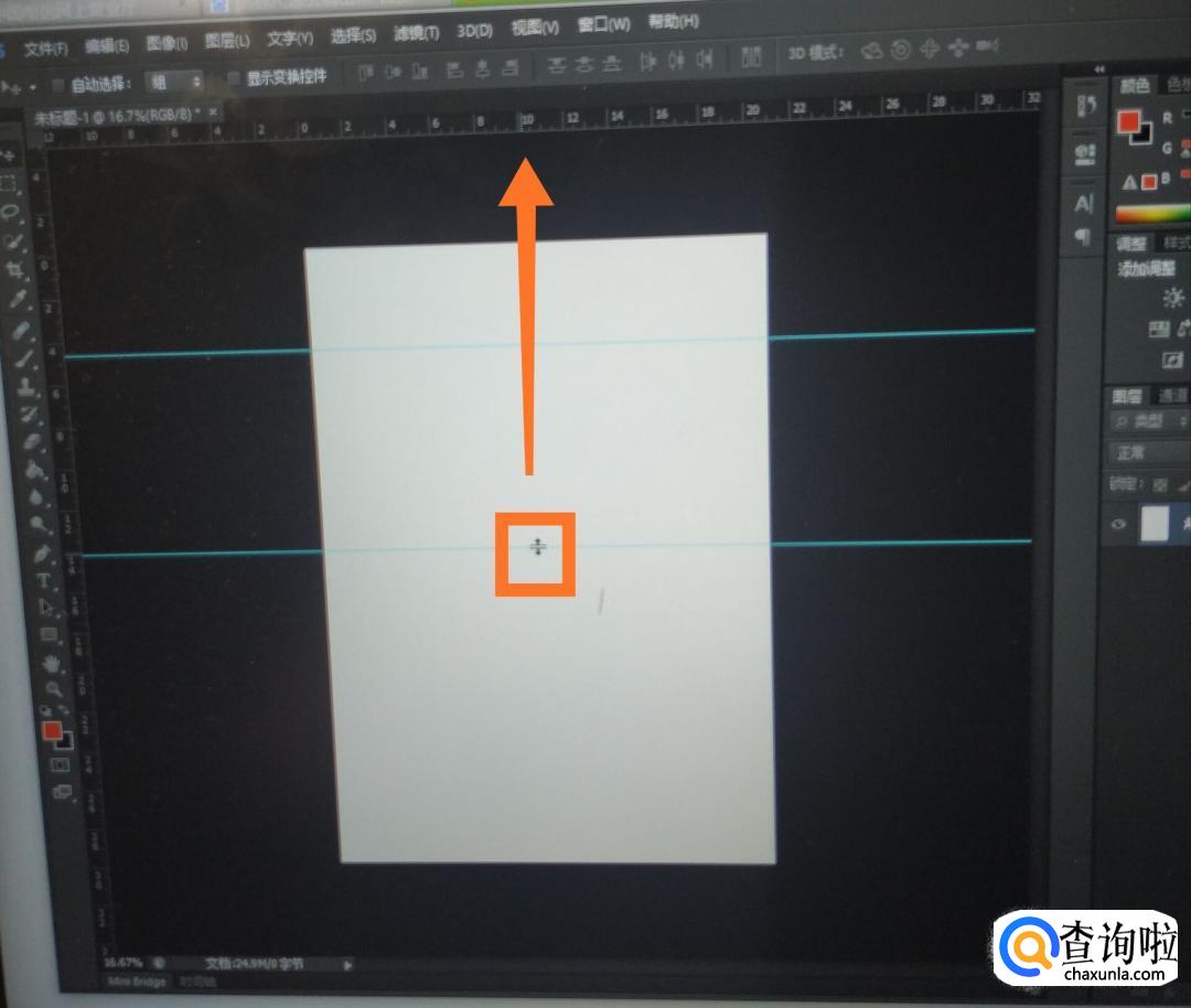 如果我们要作出一条横的辅助线,我们将鼠标放在标尺上方内部,如图,然后按住鼠标向下拖,这时就可以拖出横着的青色辅助线了,如图所示。