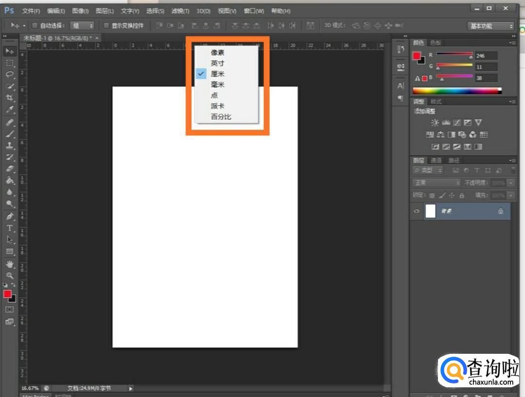 我们在标尺区域点击鼠标右键也可以快速的更改PS的标尺单位。