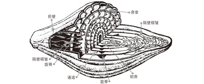 䗴壳体一般长5~10毫米,小者不及1毫米,大者可达3~6厘米,形态除纺锤形外,还有球形、透镜形、圆柱形等。䗴虽然是单细胞动物,却有着精细复杂的构造:初房是它最初的居室,位于壳体中央,初房上开有一圆形口子,是原生质溢出的孔道,随着䗴的发育,原生质从初房中分泌出来形成很多壳室,并围绕一假想轴旋转生长,依次形成若干壳圈,最后把初房层层包裹在里面。因此,观察䗴壳内部特征必须磨制壳体的各种切面。