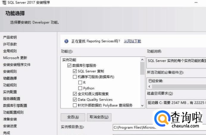 在这里选择具体需要的功能,你也可以改变安装位置,设置完成以后,下一步。,推荐选择默认实例安装。