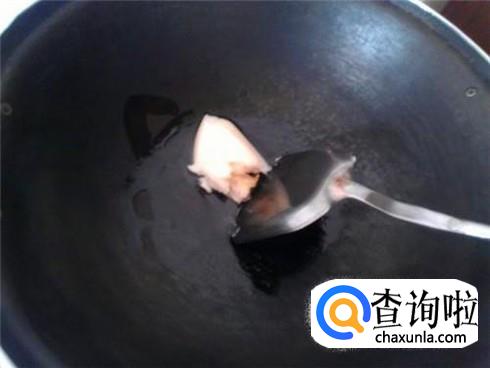 把火关掉,变黑的猪油取出来,然后用清水刷锅,刷的干净一些,但是不要用任何洗剂用品,包括洗洁精。